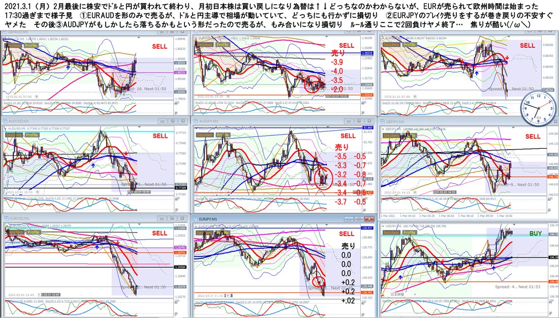 2021.3.1(月)300lot達成まであと19.52lot 2021年3月1日 2月最後に株安でドルと円が買われて終わり、月初日本株は買い戻しになり為替は↑↓どっちなのかわからないが、EURが売られて欧州時間は始まった 17:30過ぎまで様子見 ①EURAUDを形のみで売るが、ドルと円主導で相場が動いていて、どっちにも行かずに損切り …
