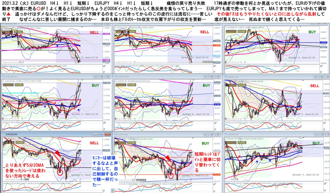 2021.3.2(火)300lot達成まであと4.02lot トレードルール見直しの為本日から少しリアルマネートレード中止にします 2021年3月3日 EURUSD H4↓ H1↓ 短期↓ EURJPY H4↓ H1↓ 短期↓ 痛恨の戻り売り失敗 17時過ぎの挙動を何とか見送っていたが、EURの下げの値動きで素直に売る〇が!よく見るとEURUSDがちょうど000ポイントだったらしく急反発を食らってしまう… EURJPY…