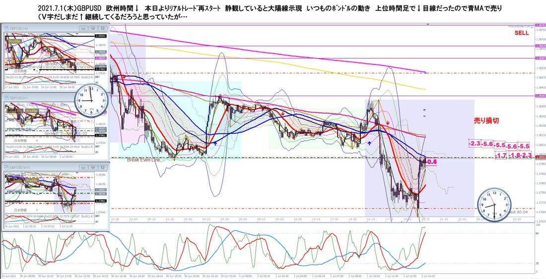 2021.7.1(木)クイックでノイジーな値動きに翻弄される 2021年7月1日 GBPUSD 欧州時間↓ 本日よりAxioryお中元イベント!に合わせリアルトレード再スタート 静観していると大陽線示現 いつものポンドルの動き 上位時間足で↓目線だったので青MAで売り (V字だしまだ↑継続してくるだろうと思っていたが… …