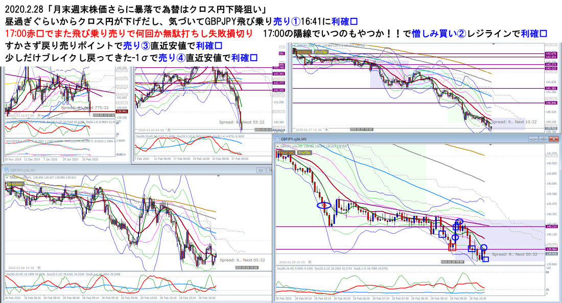 ①GBP↓に。スタート位置まで↑上に戻り止まった所で売り。しかし、さらに↑に動き大きく損切り。